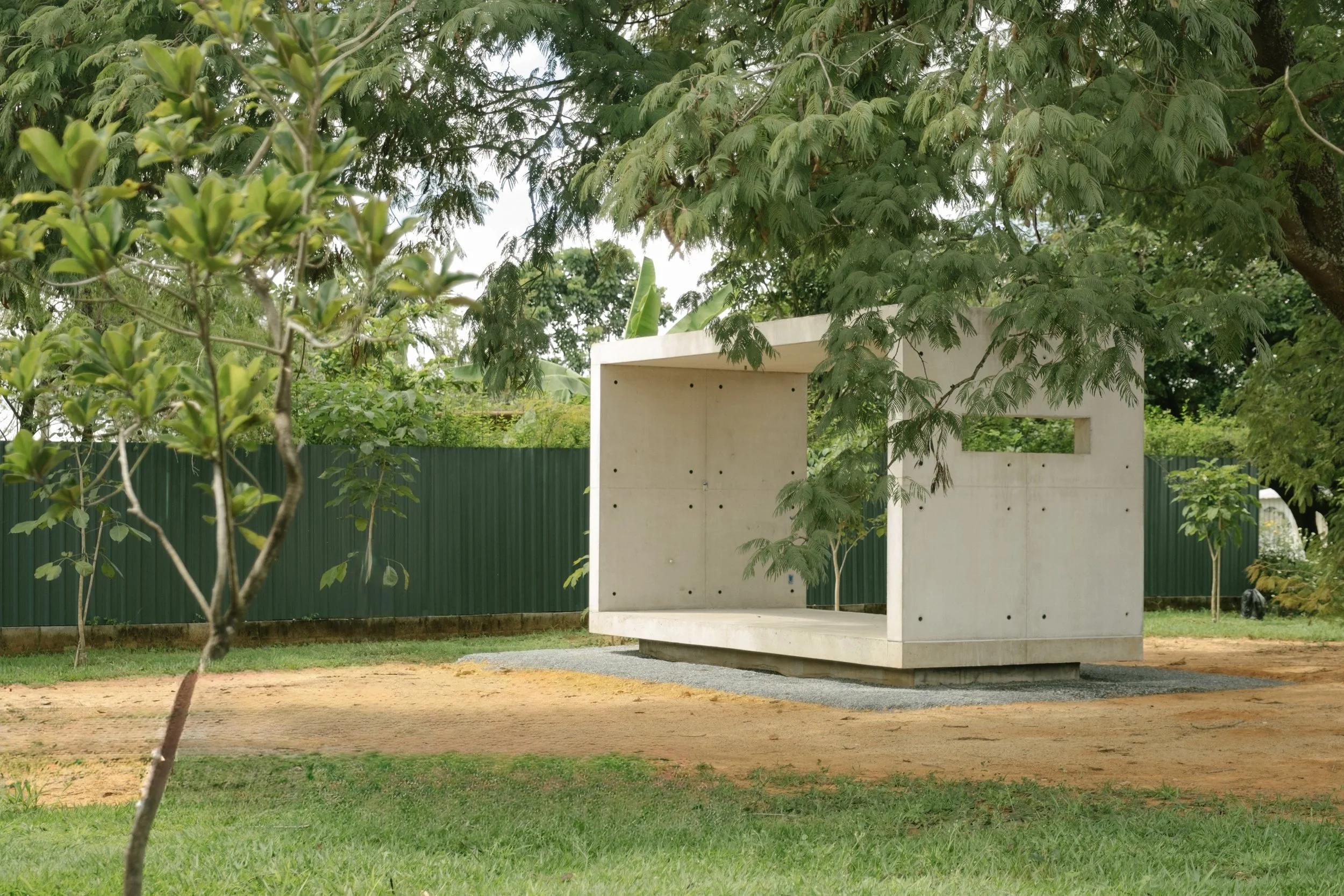 A volumetria é simples e direta, marcada pela presença estrutural do concreto, pela leveza dos planos envidraçados e pela precisão dos painéis de fechamento. Essa combinação de elementos construtivos estabelece uma linguagem sóbria, ao mesmo tempo austera e delicada, que confere ao conjunto clareza e unidade.