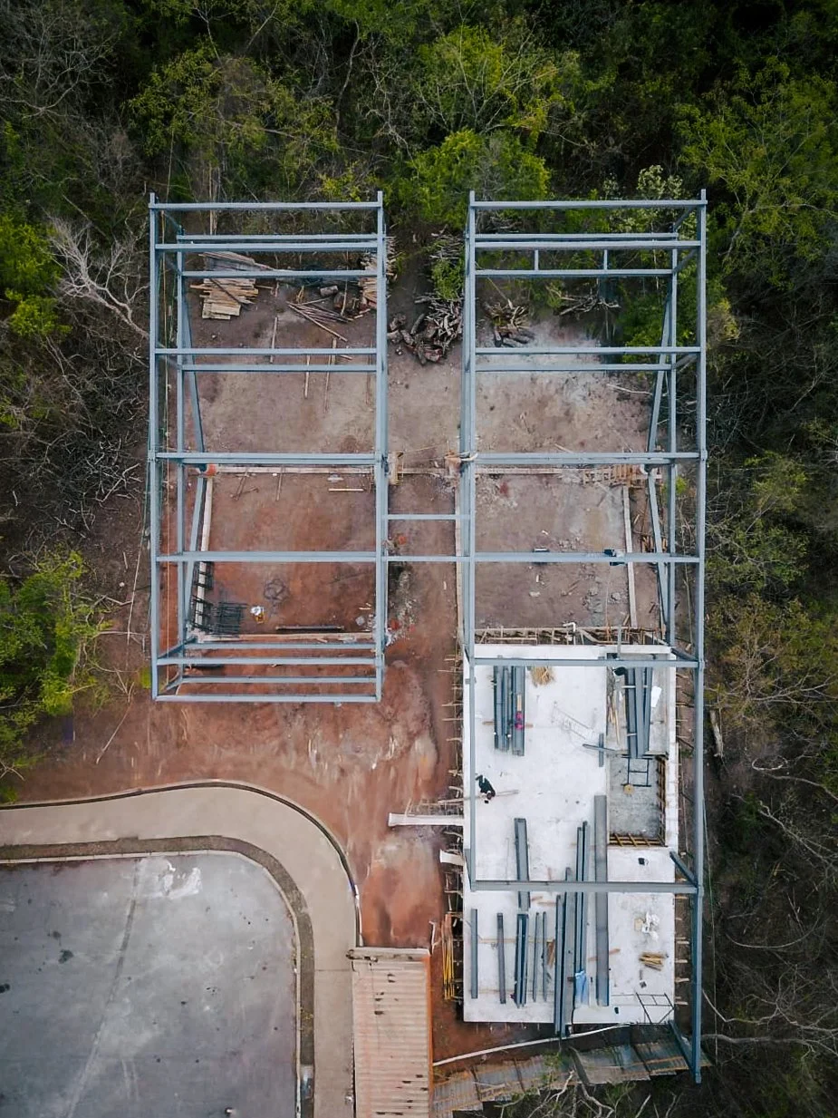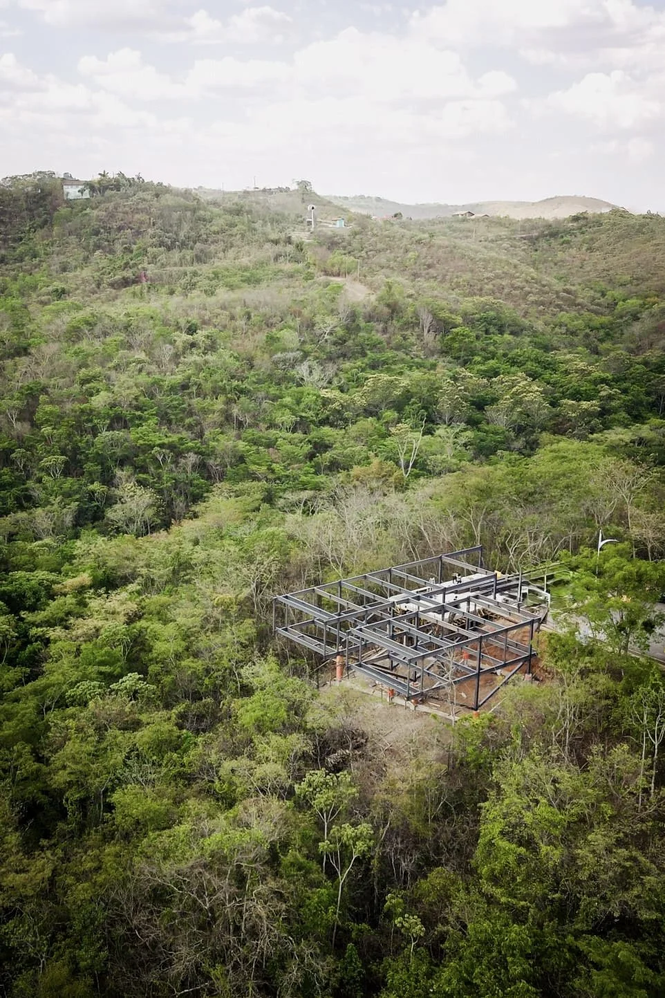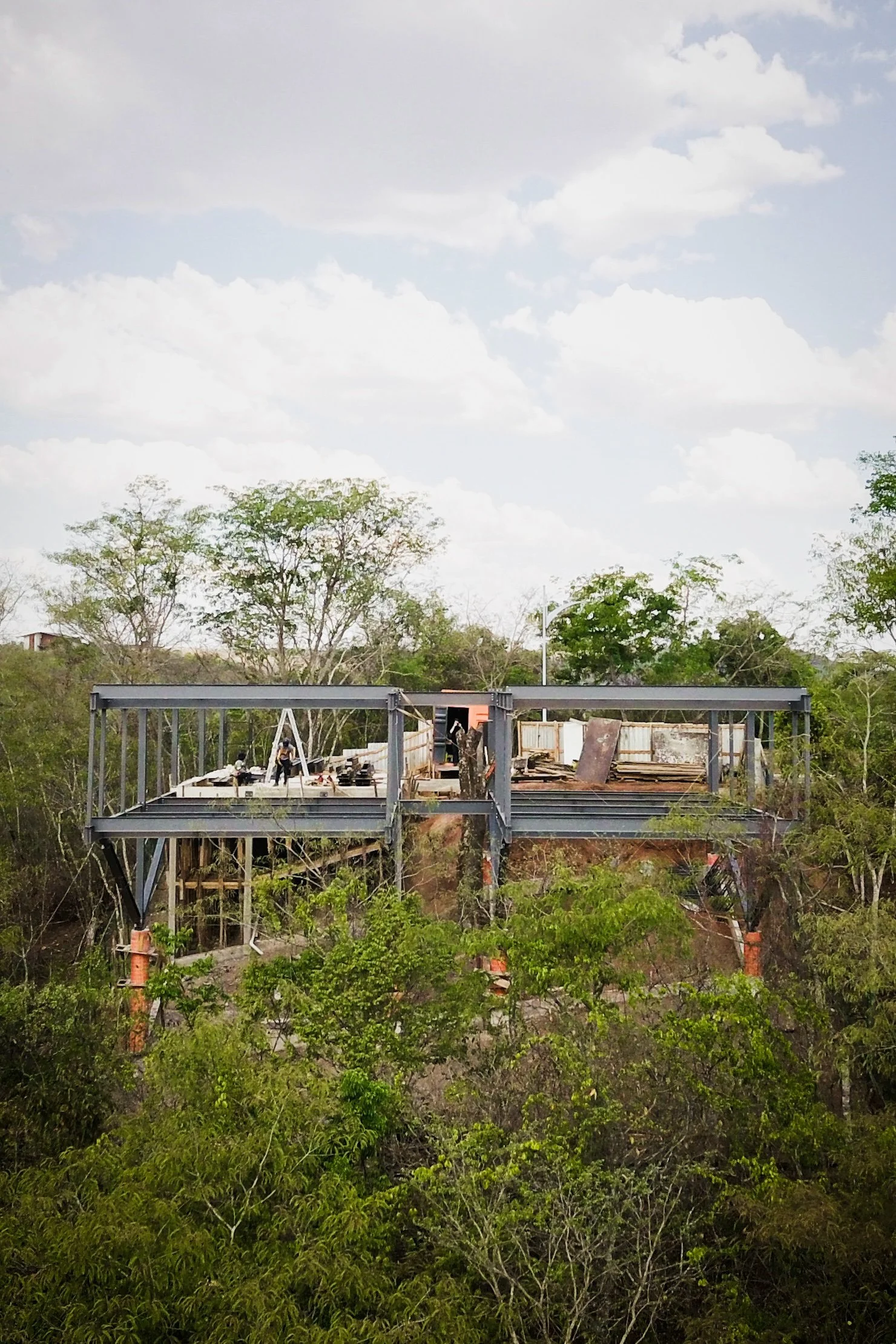 A estrutura metálica, pré-fabricada e montada in loco, surge como resposta lógica e construtiva às limitações impostas pelo terreno. Mais do que um sistema técnico-construtivo, ela se transforma em linguagem: o apoio da casa se dá por um conjunto de pilares esbeltos e suas diagonais delgadas que evocam a arquitetura vernacular das palafitas. No lugar da água, uma densa vegetação nativa ocupa o sopé do terreno, configurando um leito verde que sustenta a casa e a insere de modo sutil na paisagem.