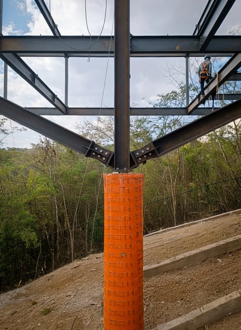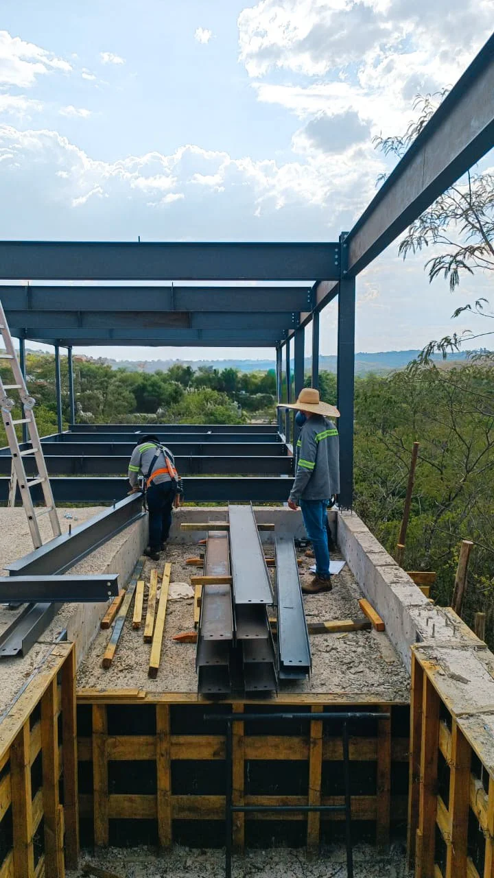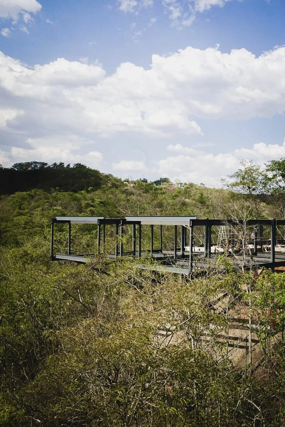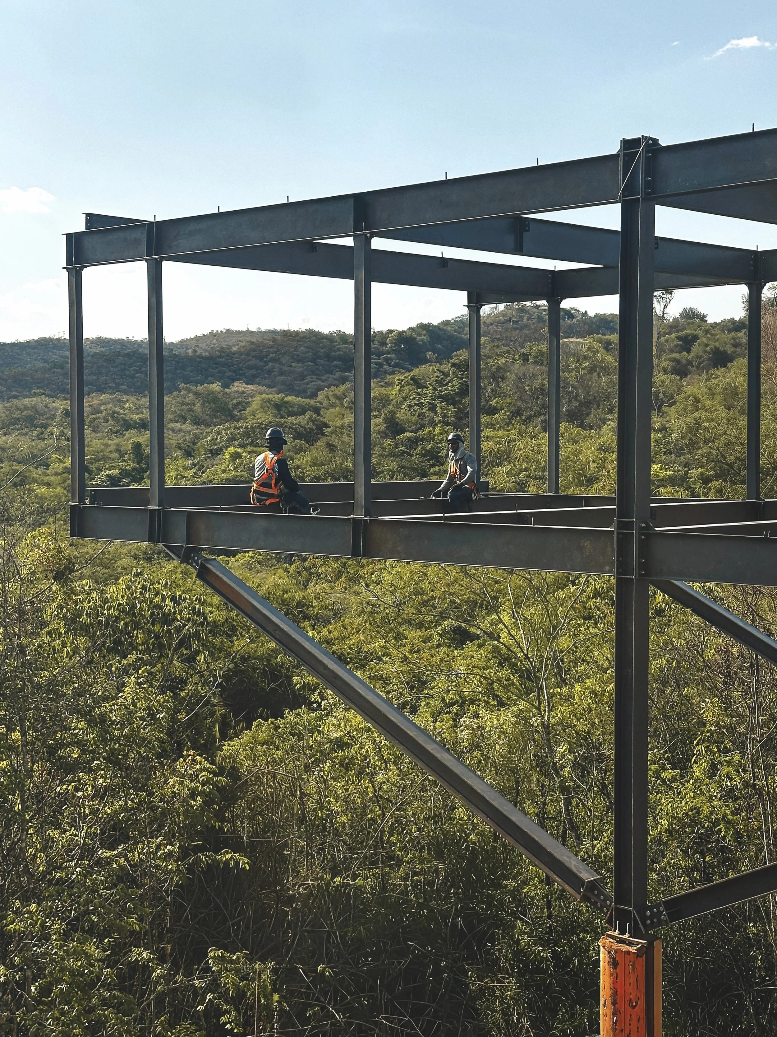A estrutura metálica, pré-fabricada e montada in loco, surge como resposta lógica e construtiva às limitações impostas pelo terreno. Mais do que um sistema técnico-construtivo, ela se transforma em linguagem: o apoio da casa se dá por um conjunto de pilares esbeltos e suas diagonais delgadas que evocam a arquitetura vernacular das palafitas. No lugar da água, uma densa vegetação nativa ocupa o sopé do terreno, configurando um leito verde que sustenta a casa e a insere de modo sutil na paisagem.